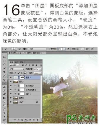 16、单击图层面板底部的“添加图层蒙版按钮”,得到白色的蒙版。选择画笔工具,设置合适的画笔大小,硬度为0%,不透明度为30%,然后涂抹右上角部分,让太阳光部分呈现出白色,不受浅绿色的影响。