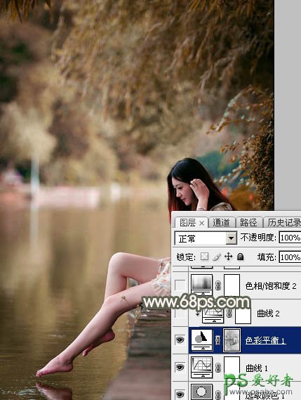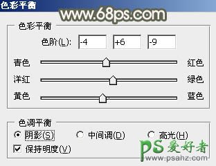 4、按Ctrl + Alt + 2 调出高光选区,按Ctrl + Shift + I 反选,然后创建色彩平衡调整图层,对阴影进行调整,参数及效果如下图。这一步给暗部增加绿色。