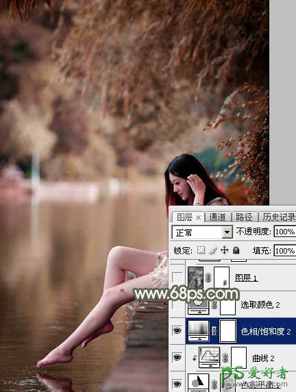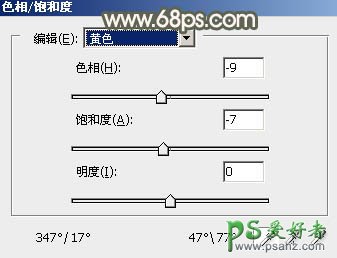 6、创建色相/饱和度调整图层,对黄色进行调整,参数及效果如下图。这一步快速把图片中的黄色转为红褐色。