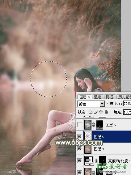 12、新建一个图层,用椭圆选框工具拉出下图所示的椭圆选区,羽化60个像素后填充红褐色:#926C58,混合模式改为“滤色”,不透明度改为:70%,效果如下图。这一步给图片增加高光。