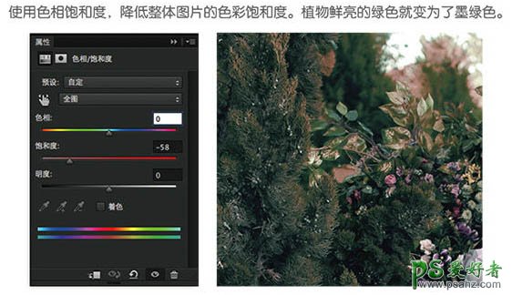 使用色相饱和度,降低整体图片的色彩饱和度。植物鲜亮的绿色就变为了墨绿色。
