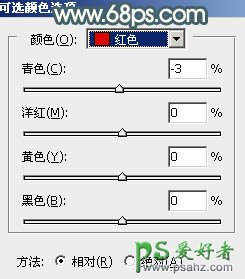 2、创建可选颜色调整图层,对红、黄、绿进行调整,参数设置如图3 - 5,效果如图6。这一步主要加强图片中的暖色。