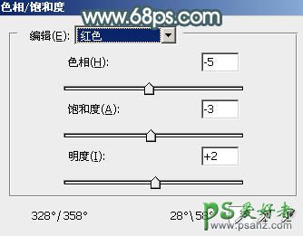 8、创建色相/饱和度调整图层,对红色进行调整,参数及效果如下图。这一步把红色转为红褐色。