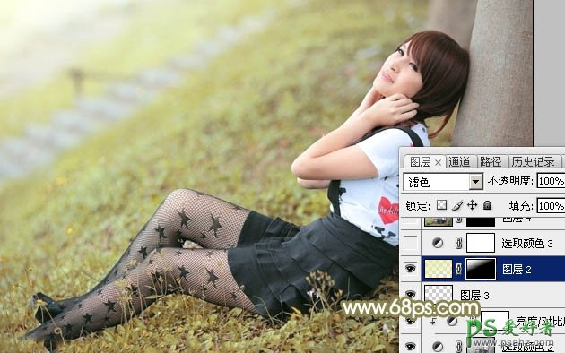 9、按Ctrl + Alt + 2 调出高光选区,新建一个图层填充淡黄色:#E9F0AC,混合模式改为“滤色”,取消选区后添加图层蒙版,用黑白渐变拉出白色至黑色线性渐变,如下图。