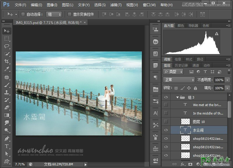 PS婚片调色实例教程:给水云间海景婚纱照调出蓝色仙境场景效果