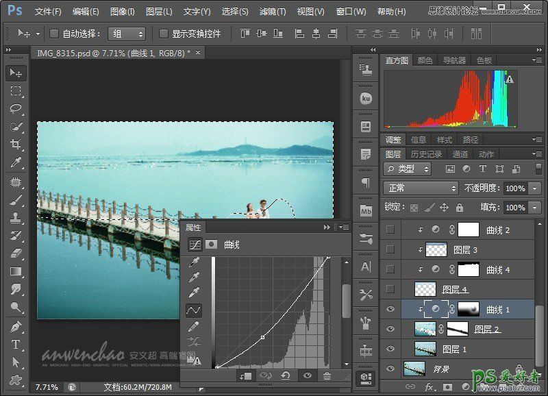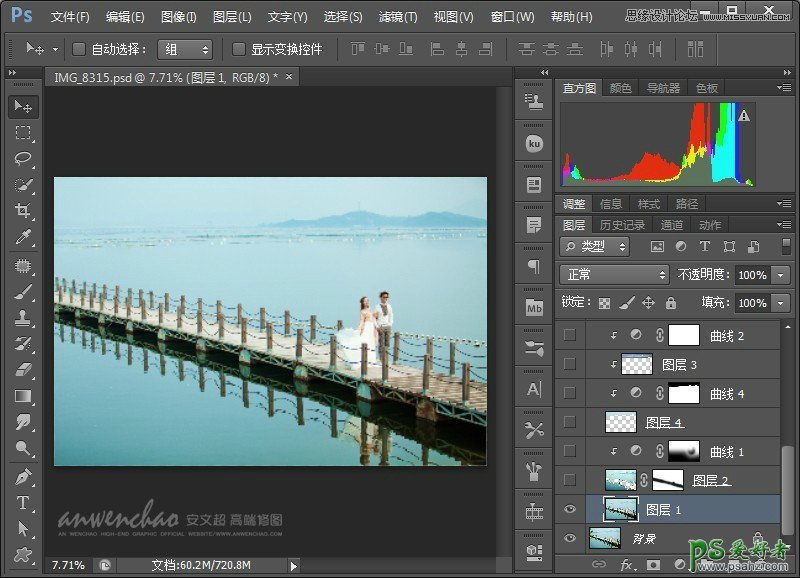 PS婚片调色实例教程:给水云间海景婚纱照调出蓝色仙境场景效果