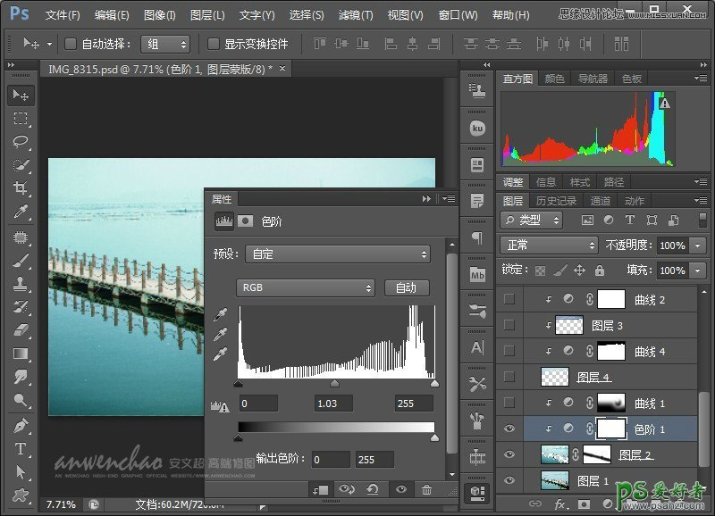 把水面做一个选区 可以选用计算和其他选区工具然后自动色阶