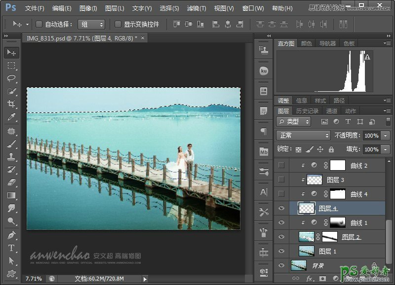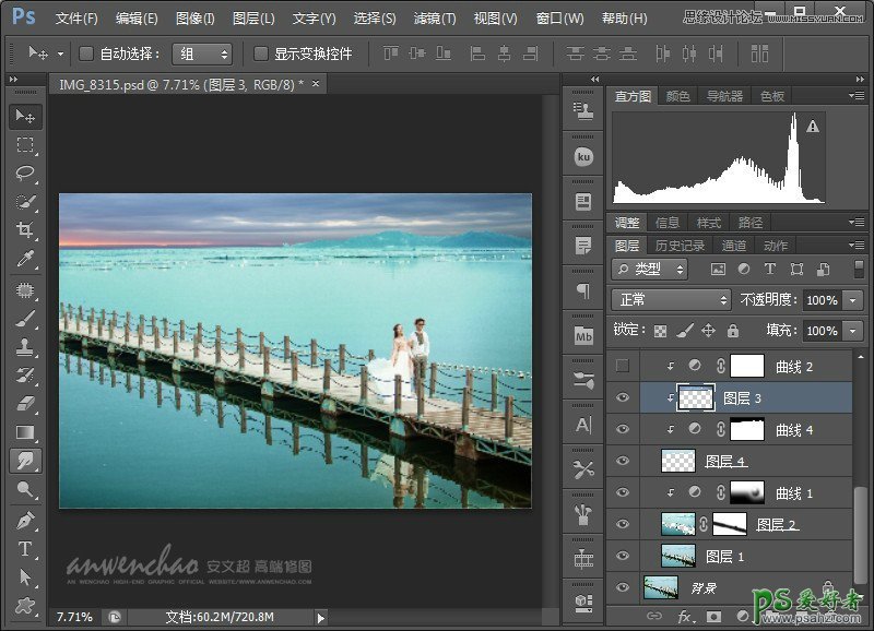 PS婚片调色实例教程:给水云间海景婚纱照调出蓝色仙境场景效果