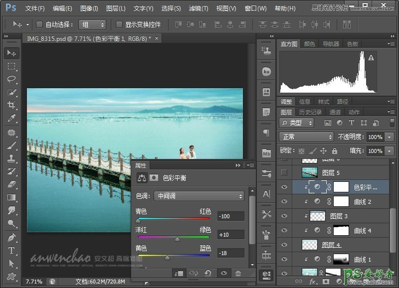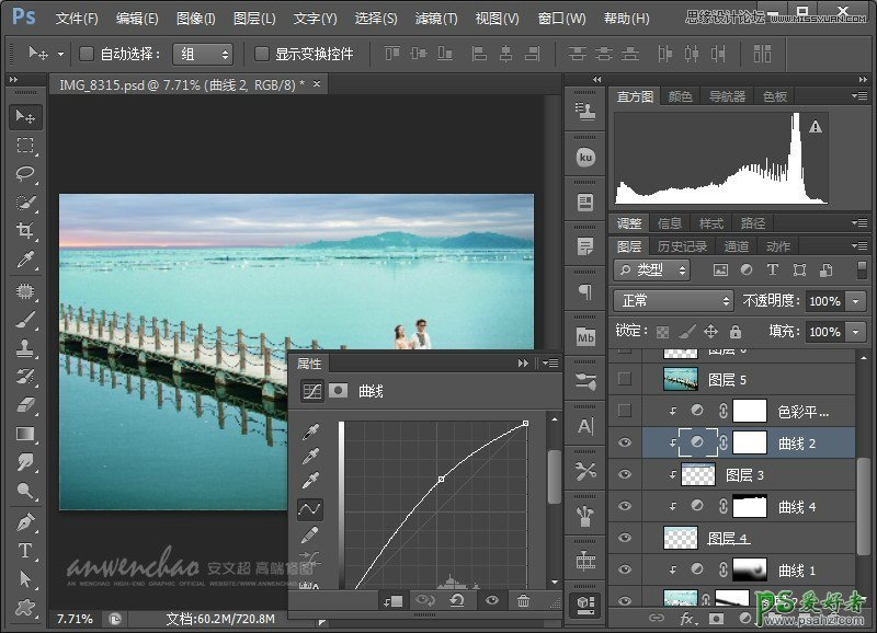 PS婚片调色实例教程:给水云间海景婚纱照调出蓝色仙境场景效果