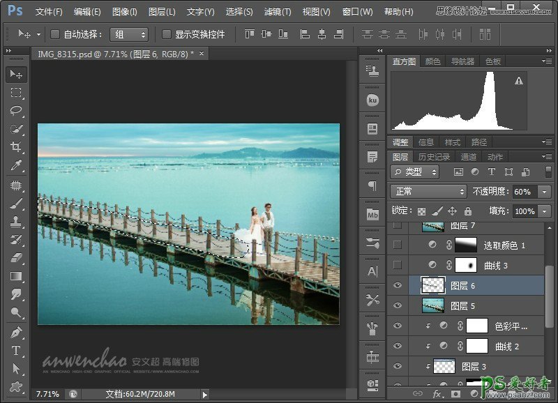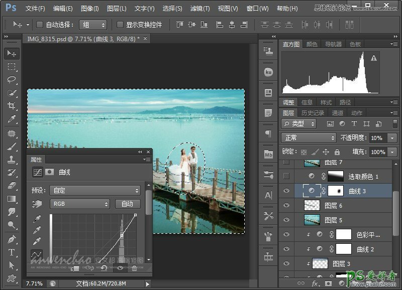PS婚片调色实例教程:给水云间海景婚纱照调出蓝色仙境场景效果