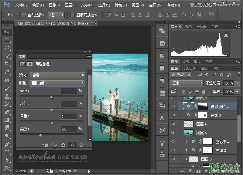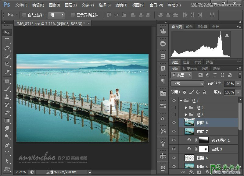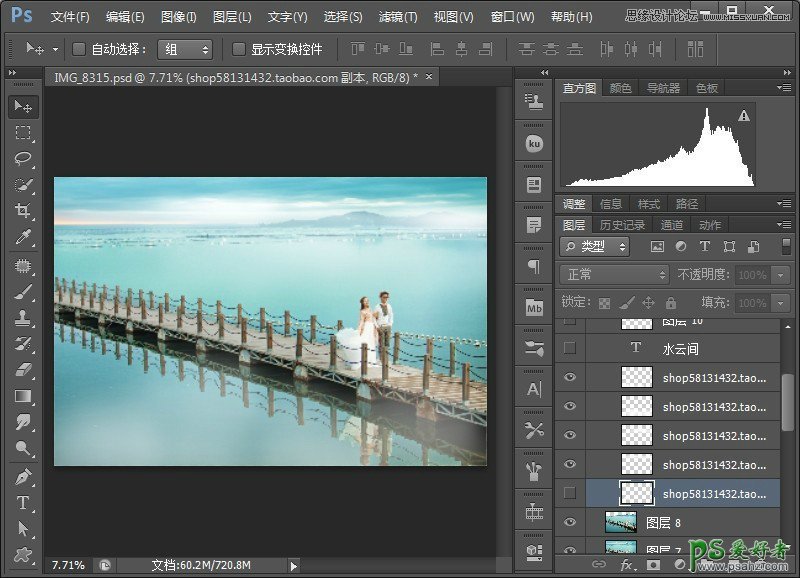 PS婚片调色实例教程:给水云间海景婚纱照调出蓝色仙境场景效果