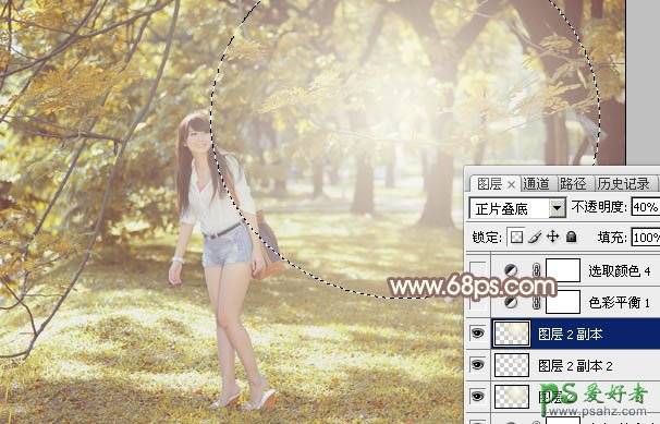 9、新建一个图层,用椭圆选框工具拉出下图所示的大椭圆选区,羽化100个像素后填充同上的淡黄色,混合模式改为“正片叠底”,不透明度改为:40%,效果如下图。