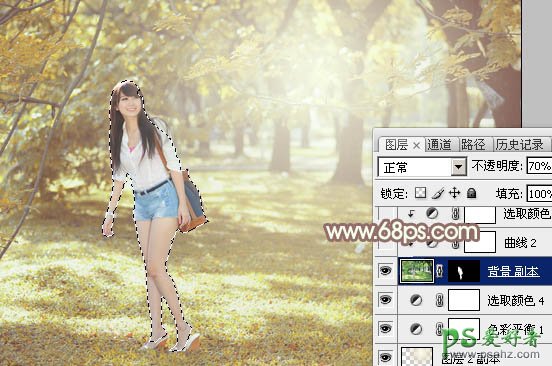 12、把背景图层复制一层,按Ctrl + Shift + ] 置顶,按住Alt键添加图层蒙版,用白色画笔把人物部分擦出来,再适当降低图层不透明度,效果如下图。