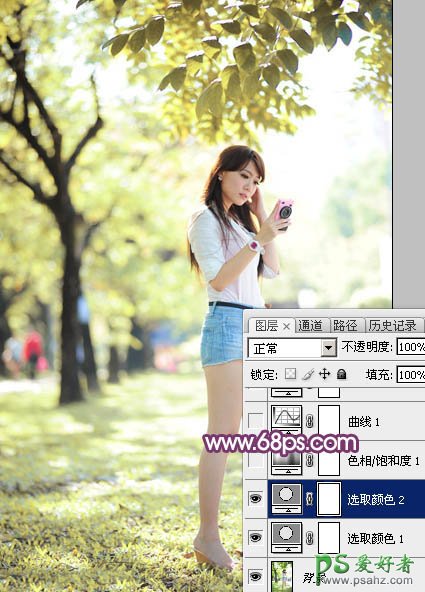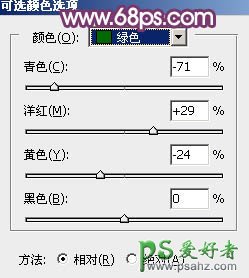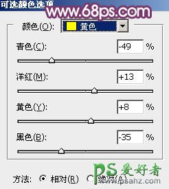 2、创建可选颜色调整图层,再对黄色及绿色进行调整,参数及效果如下图。这一步给图片增加黄褐色。
