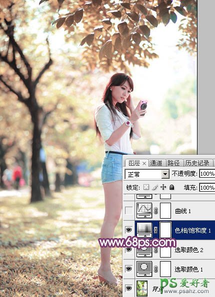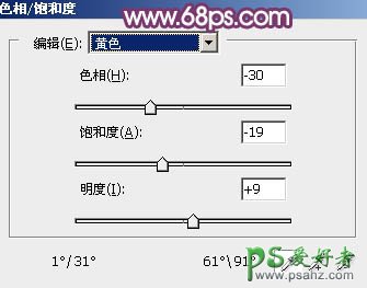3、创建色相/饱和度调整图层,对黄色进行调整,参数及效果如下图。这一步快速把图片中的黄色转为红褐色。
