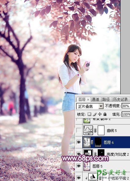 90后少女图片调色:给公园里长腿90后少女写真照调出甜美紫红色