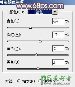 5、创建可选颜色调整图层,对蓝色,洋红进行调整,参数及效果如下图。这一步适当减少图片中的蓝色。
