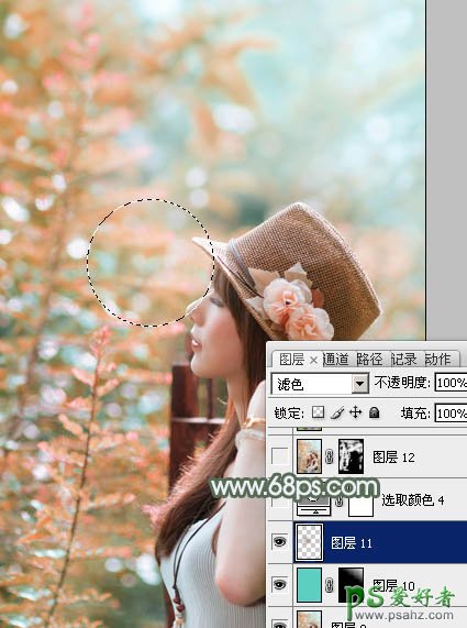 14、新建一个图层,用椭圆选框工具拉出下图所示的椭圆选区,羽化50个像素后填充暗红色:#8C6A59,混合模式改为“滤色”,效果如下图。这一步给图片局部增加高光。