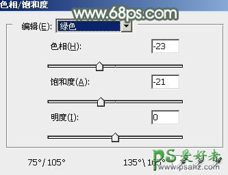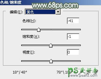1、按Ctrl + ALt + 2 调出高光选区,然后创建色相/饱和度调整图层,对黄色,绿色进行调整,参数及效果如下图。这一步快速把图片高光颜色转为橙红色。