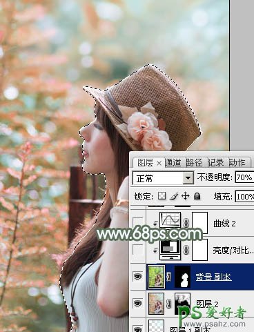 10、把背景图层复制一层,按Ctrl + Shift + ] 置顶,按住Alt键添加图层蒙版,用白色画笔把人物部分擦出来,确定后把不透明度设置为70%,效果如下图。
