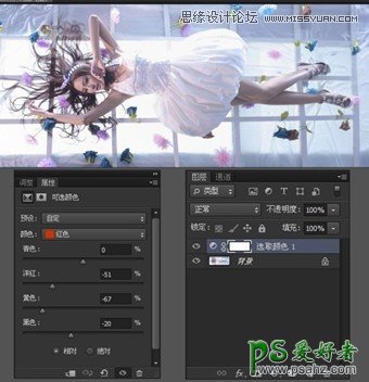 4、因要将整体提升饱和度,所以在提高饱和度之前,先用可选颜色将皮肤去红,并提亮。