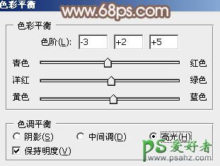 7、按Ctrl + Alt + 2 调出高光选区,按Ctrl + Shift + I 反选,然后创建色彩平衡调整图层,对高光进行调整,参数及效果如下图。