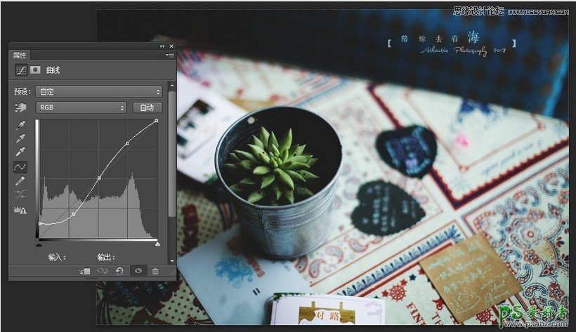 photoshop给办公室里温馨的小物件特写照片调出质感温馨的色彩 原图。拍摄于下午5点,室内,用的是A档拍的,光圈1.6 首先是曲线,我习惯S型曲线,增加对比度。比较不同的一点是,我喜欢曲线低端,暗部拉高,减去一点暗补对比。 然后整体曲