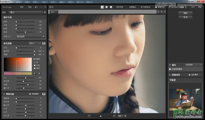 最后用个磨皮插件调整肤色,同样的加亮加暖。妹子皮肤好磨皮选项全都调到最小。