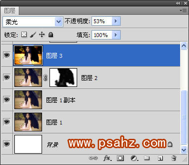 4、盖印图层(ctrl+shift+alt+e),将图层模式设为柔光,不透明度为53%