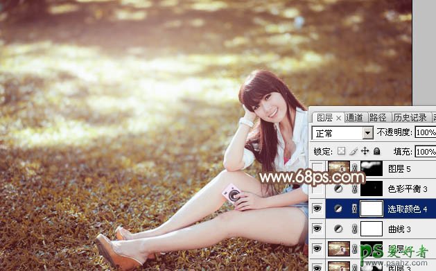 Photoshop给草地上自拍的唯美少女写真照调出阳光淡褐色效果