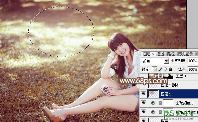 11、新建一个图层,用椭圆选框工具在下图位置拉一个椭圆选区,羽化100个像素后填充红褐色:#7D675F,混合模式改为“滤色”,效果如下图。这一步增加图片高光亮度。