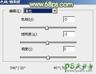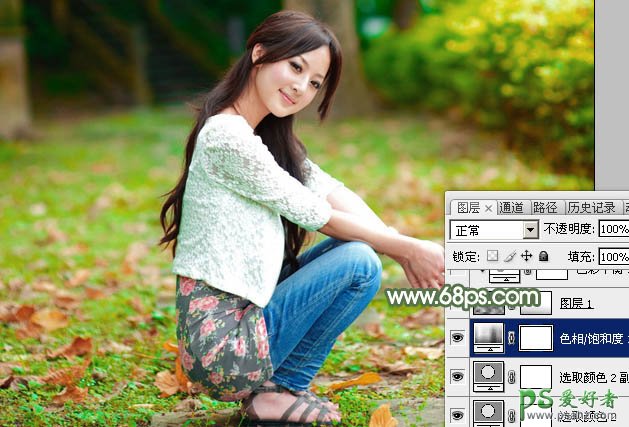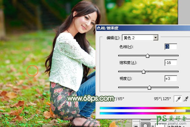 4、创建色相/饱和度调整图层,对黄色进行调整,参数设置如图7,然后再选择绿色,用吸管吸取图8红圈位置的颜色再调整,参数及效果如下图。这一步主要降低图片中暖色的饱和度。