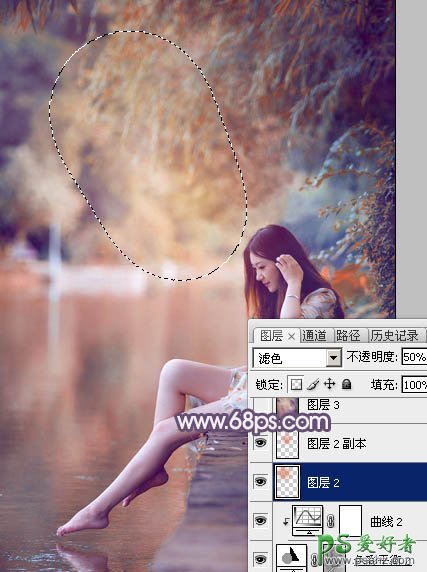 12、新建一个图层,混合模式改为“滤色”,把前景色设置为橙黄色:#DA811C,用柔边画笔把下图选区部分涂上前景色,效果如下图。这一步给图片中间位置增加高光。