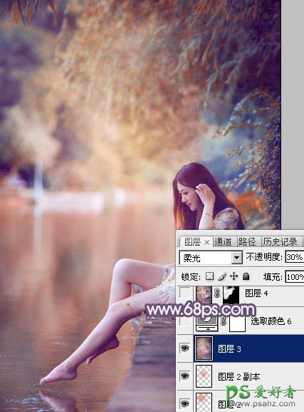 13、新建一个图层,按Ctrl + Alt + Shift + E 盖印图层,选择菜单:滤镜 > 模糊 > 动感模糊,角度设置为-45度,距离设置为150,确定后把混合模式改为“柔光”,不透明度改为:30%,效果如下图。这一步把图片柔化处理。