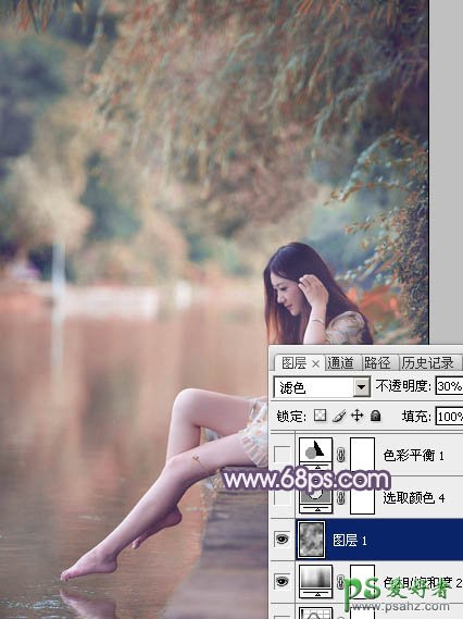 6、新建一个图层,按字母键“D”把前背景颜色恢复到默认的黑白,然后选择菜单:滤镜 > 渲染 > 云彩,确定后把混合模式改为“滤色”,不透明度改为:30%,如下图。这一步给图片增加梦幻效果。
