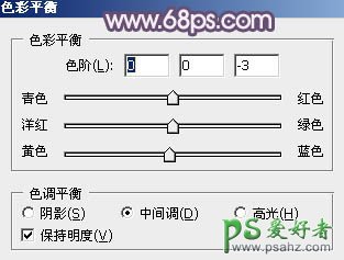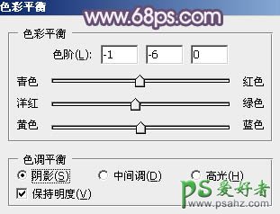 8、创建色彩平衡调整图层,对阴影、中间调,高光进行调整,参数设置如图24 - 26,效果如图27。这一步主要给图片暗部及高光部分增加蓝色。