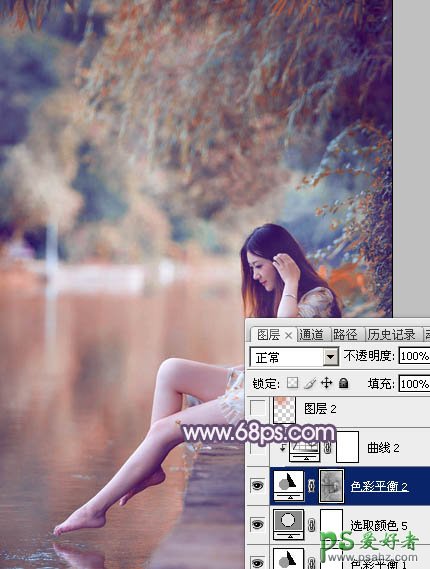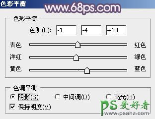 10、按Ctrl + Alt + 2 调出高光选区,按Ctrl + Shift + I 反选,然后创建色彩平衡调整图层,对阴影进行调整,参数及效果如下图。这一步给图片暗部增加蓝色。