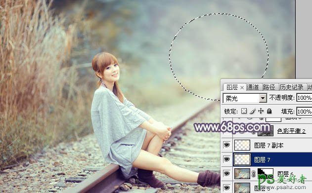 14、新建一个图层,用椭圆选框工具拉出下图所示的椭圆选区,羽化80个像素后填充淡黄色:#FEF8CF,混合模式改为“柔光”,取消选区后按Ctrl + J 把当前图层复制一层。