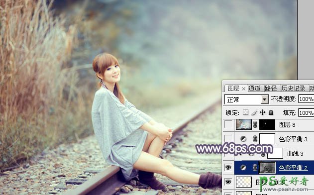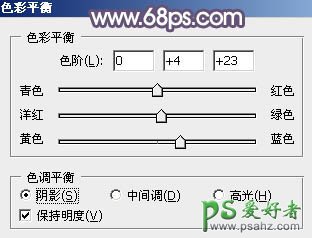 15、按Ctrl + Alt + 2 调出高光选区,按Ctrl + Shift + I 反选,然后创建色彩平衡调整图层,对阴影进行调整,参数及效果如下图。这一步给图片暗部增加蓝色。