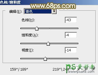 1、打开素材图片,创建色相/饱和度调整图层,对黄、绿、青进行调整,参数设置如图1 - 3,确定后把不透明度改为:70%,效果如图4。这一步把图片中的黄绿色转为黄褐色。