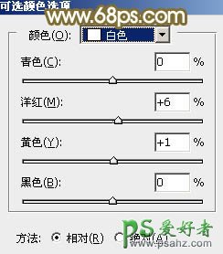 2、创建可选颜色调整图层,对红、黄、白进行调整,参数设置如图5 - 7,确定后把不透明度改为:30%,效果如图8。这一步给图片增加黄褐色。