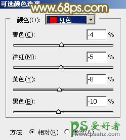 7、创建可选颜色调整图层,对红、黄,白进行调整,参数设置如图25 - 27,确定后按Ctrl + Alt + G 创建剪切蒙版,效果如图28。这一步把暗部暖色稍微调淡一点。