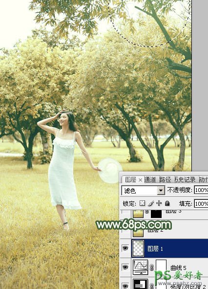 14、新建一个图层,用椭圆选框工具在右上角拉一个椭圆选区,羽化50个像素后填充黄绿色:#93A75C,混合模式改为“滤色”,效果如下图。这一步给图片增加高光。