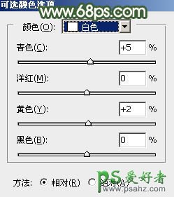 1、打开素材图片,创建可选颜色调整图层,对黄、绿、白,黑进行调整,参数设置如图1 - 4,效果如图5。这一步给图片增加黄褐色。