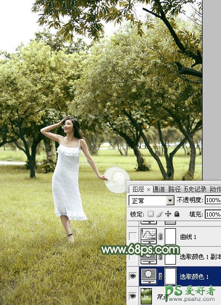 PS美少妇图片调色,PS调色教程:给春天里外景自拍的性感少妇图片调出灿烂的黄绿色,这种色彩给人一种清新,时尚的清爽感,美少妇也变得更清纯,唯美,喜欢这种色彩的设计师们试一下吧! 原图 最终效果 1、打开素材图片,创建可选颜色调整图层,对黄