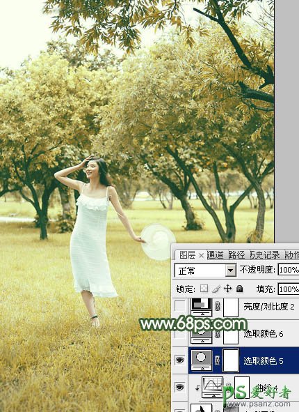 PS调色教程:给春天里外景自拍的性感少妇图片调出灿烂的黄绿色