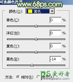 11、再创建可选颜色调整图层,对黄色进行调整,参数及效果如下图。这一步把图片中的黄色稍微调亮一点。