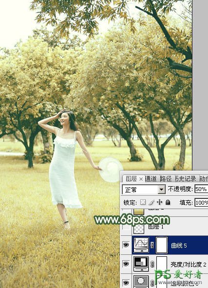 PS调色教程:给春天里外景自拍的性感少妇图片调出灿烂的黄绿色