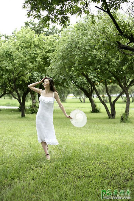 PS调色教程:给春天里外景自拍的性感少妇图片调出灿烂的黄绿色