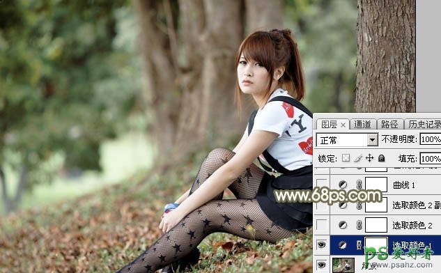 Photoshop调色实例教程学习:给黑丝袜树林风景中的MM调出淡暖色